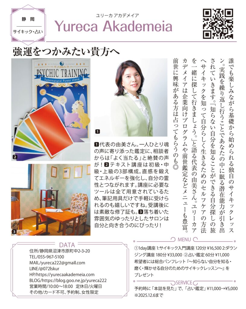 女性情報誌「CREA 2024年冬号」にて、ユリーカアカデメイア代表の村越由美が掲載されました。「一人一人魂の声に寄り添ったよく当たる鑑定」として、多くの方からご好評いただいていると紹介されました。