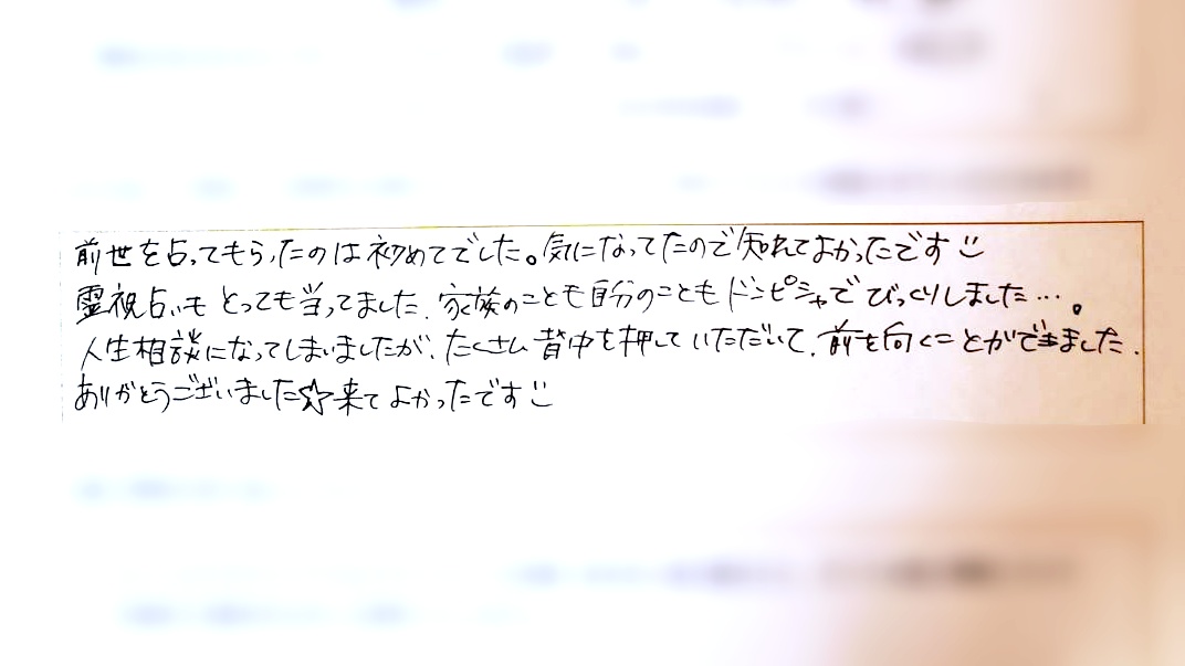 前世を占ってもらったのは初めてでした。気になってたので知れてよかったです! 霊視占いもとっても当ってました。家族のことも自分のこともドンピシャでびっくりしました・・・。 人生相談になってしまいましたが、たくさん背中を押していただいて、前を向くとができました。 ありがとうございました☆来てよかったです
