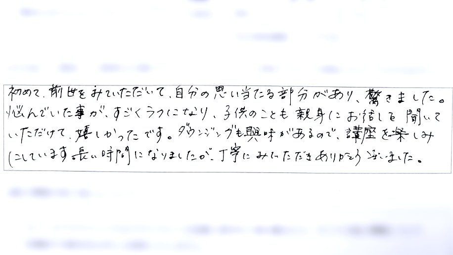 初めて前世をみていただいて、自分の思い当たる部分があり、驚きました。 悩んでいた事がすごくラクになり、子供のことも親身にお話しを聞いていただけて、嬉しかったです。ダウンジングも興味があるので、講座を楽しみにしています。長い時間になりましたが、丁寧にみていただきありがとうございました。