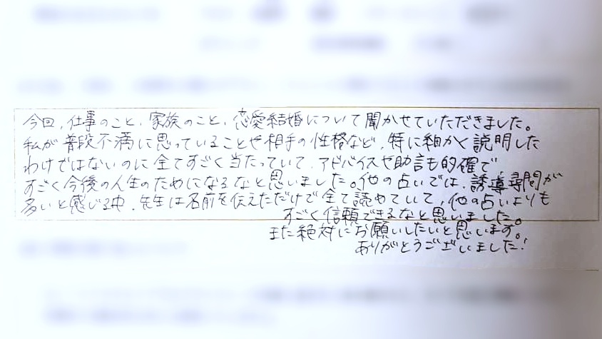 今回、仕事のこと、家族のこと、恋愛結婚について聞かせていただきました。私が普段不満に思っていることや相手の性格など、特に細かく説明したわけではないのに全てすごく当たっていて、アドバイスや助言も的確ですごく今後の人生のためになるなと思いました。他の占いでは、誘導尋問が多いと感じる中、先生は名前を伝えただけで全て読めていて、他の占いよりもすごく信頼できるなと思いました。