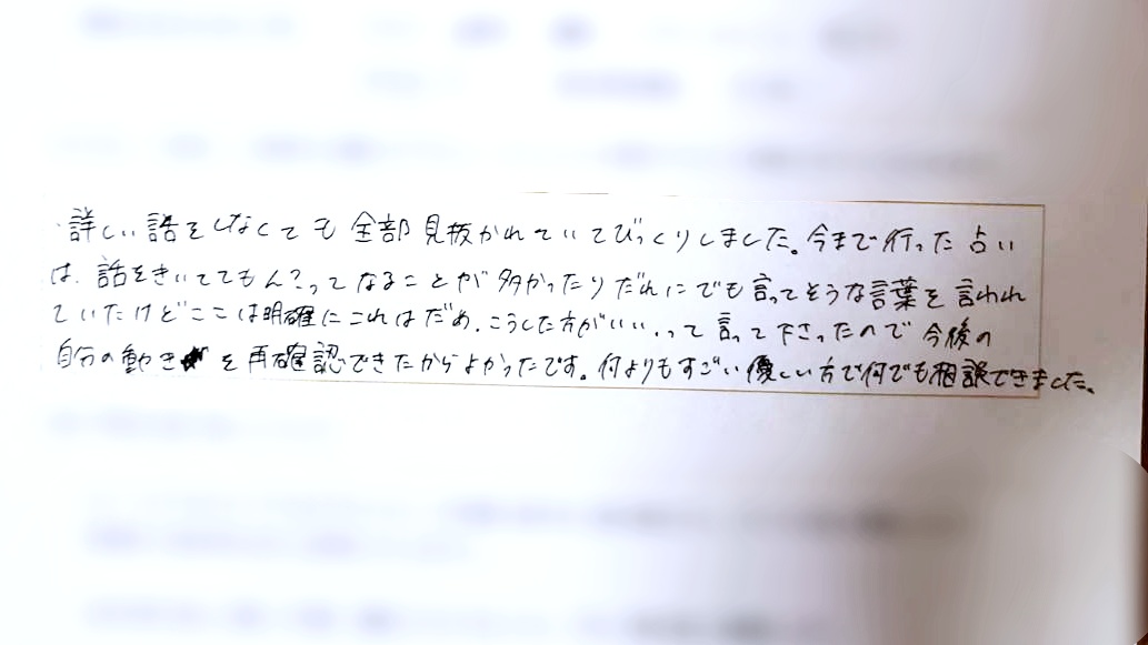 詳しい話をしなくても全部見抜かれていてびっくりしました。今まで行った占いは 話をきいてても、ん?ってなることが多かったり、だれにでも言ってそうな言葉を言われていたけど、ここは明確にこれはだめ、こうした方がいいって言って下さったので、今後の自分の動きを再確認できたからよかったです。何よりもすごい優しい方で、何でも相談できました。