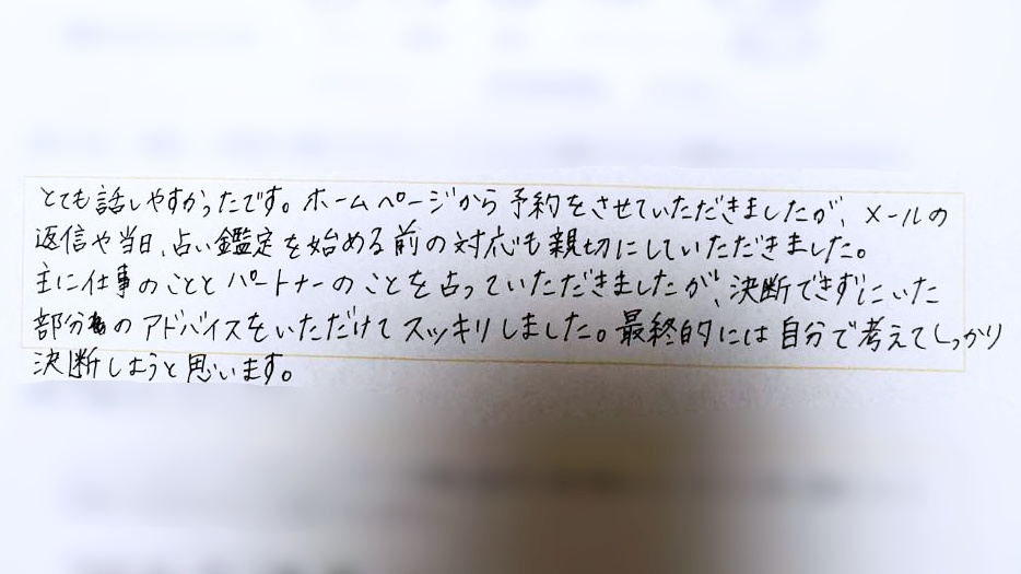 とても話しやすかったです。ホームページから予約をさせていただきましたが、メールの返信や当日、占い鑑定を始める前の対応も親切にしていただきました。 主に仕事のこととパートナーのことを占っていただきましたが、決断できずにいた部分のアドバイスをいただけてスッキリしました。最終的には自分で考えてしっかり決断しようと思います。