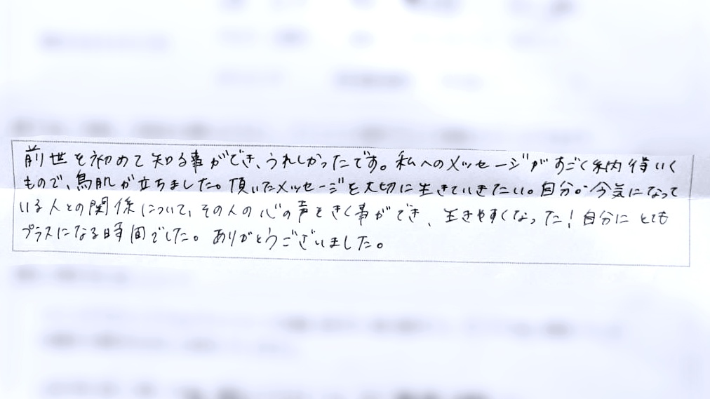 前世を初めて知る事ができ、うれしかったです。私へのメッセージがすごく納得いくもので、鳥肌が立ちました。頂いたメッセージを大切に生きていきたい。自分が今気になっている人との関係について、その人の心の声をきく事ができ、生きやすくなった!自分にとてもプラスになる時間でした。ありがとうございました。