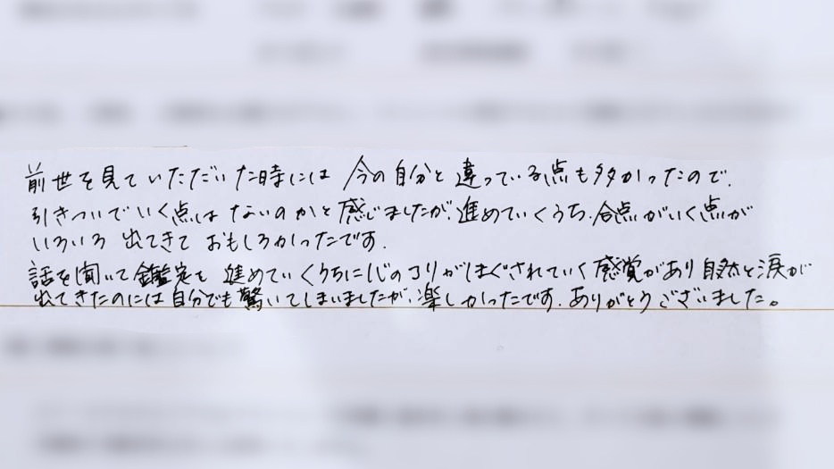 前世を見ていただいた時には今の自分と違っている点も多かったので、引きついでいく点はないのかと感じましたが、進めていくうち、合点がいく点がいろいろ出てきておもしろかったです。 話を聞いて鑑定を進めていくうちに心のコリがほぐされていく感覚があり自然と涙が出てきたのには自分でも驚いてしまいましたが、楽しかったです。ありがとうございました。