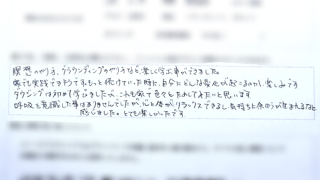 瞑想のやり方、グラウンディングのやり方など、楽しく学ぶ事ができました。家でも実践できそうです。